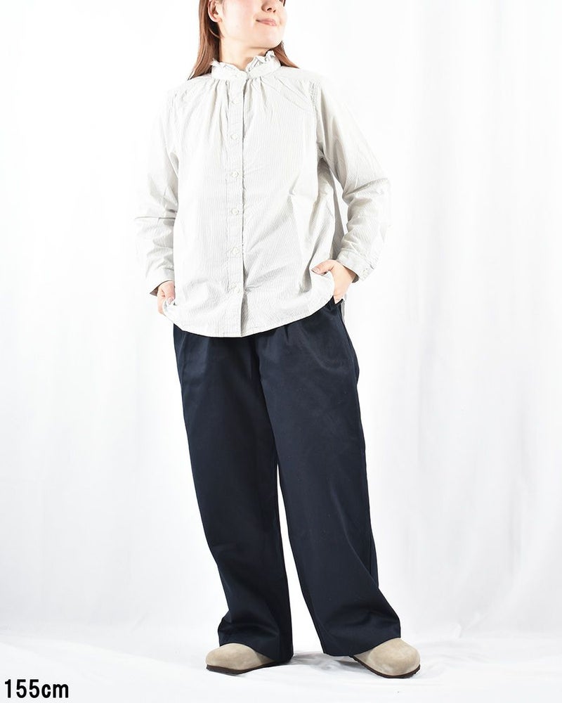 前ネックにはギャザーが入り、裾はシャツテール仕様。程よく肩が落ちたデザインで、1枚で着ていただいてもすっきりまとまります。