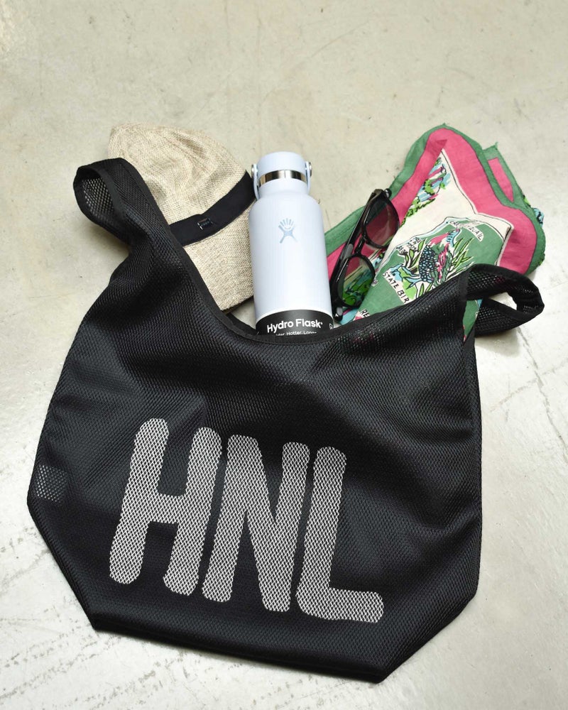 HNL(ホノルル国際空港)の空港コード。開放感のある街のイメージと美しいアルファベットの並びから生まれたメッシュバッグ。
