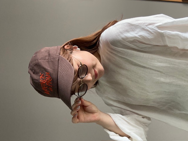 Shinzoneのキャップはこれで2つ目。浅めの形が骨格にフィットし、ブラウン×オレンジの配色が差し色として大活躍。