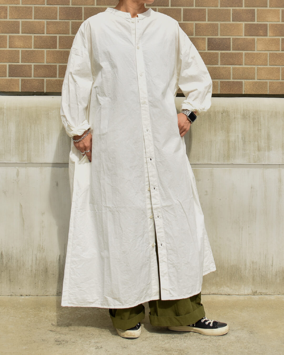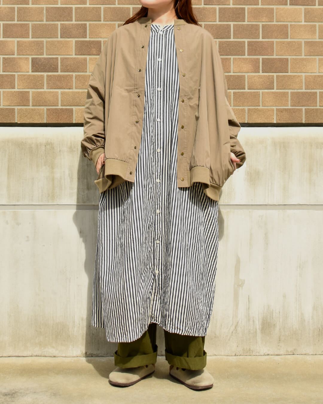 広がりすぎないシルエットで、ワンピースとしても羽織りとしてもすっきり着こなせます。