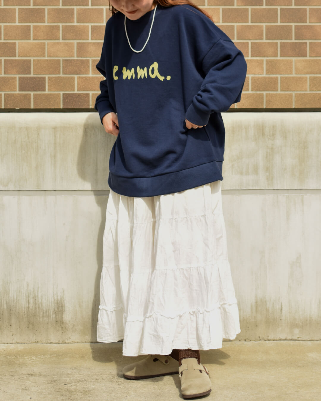 フロッキー調の柔らかなプリントが、スウェットの風合いとマッチして大人の抜け感を演出します。