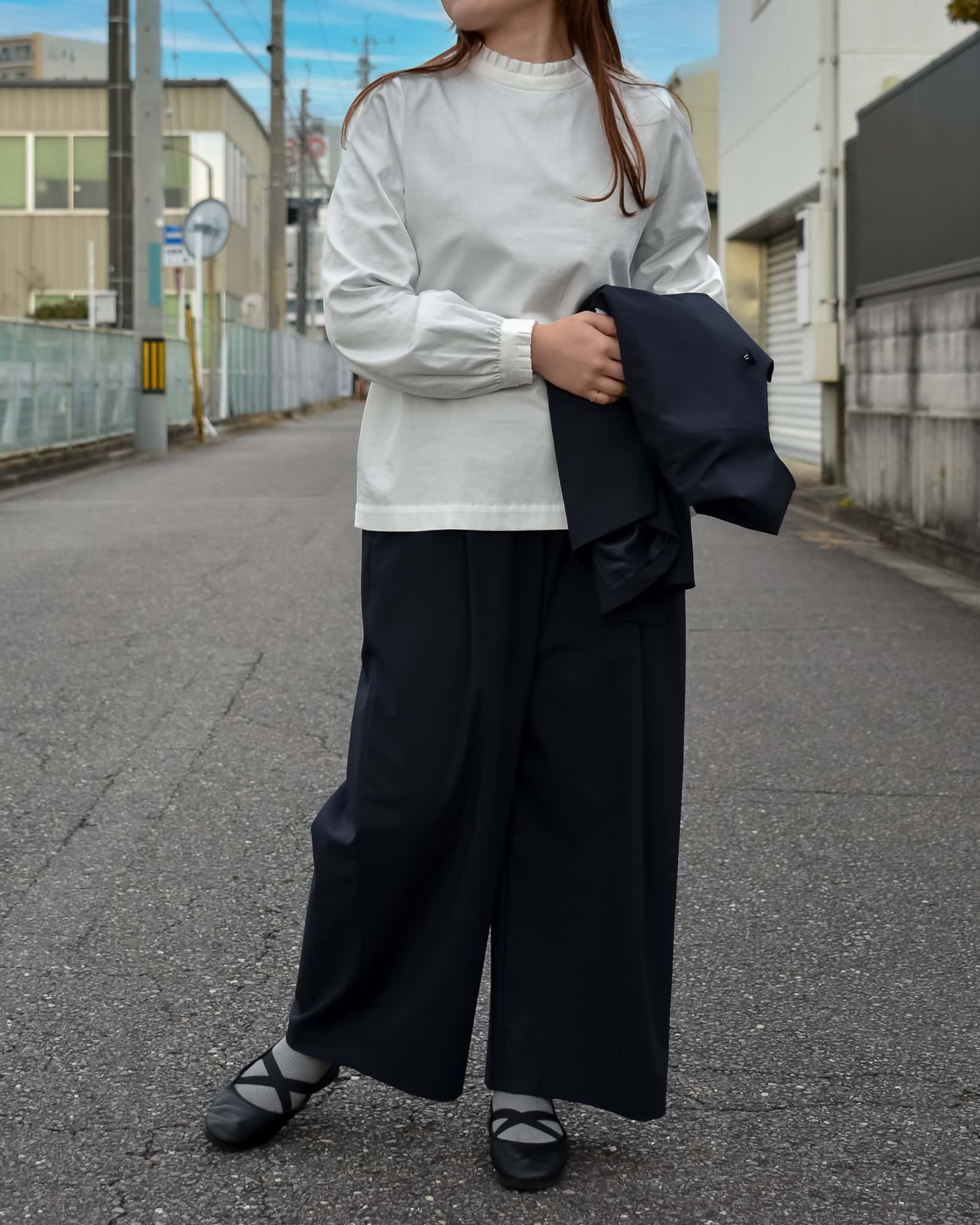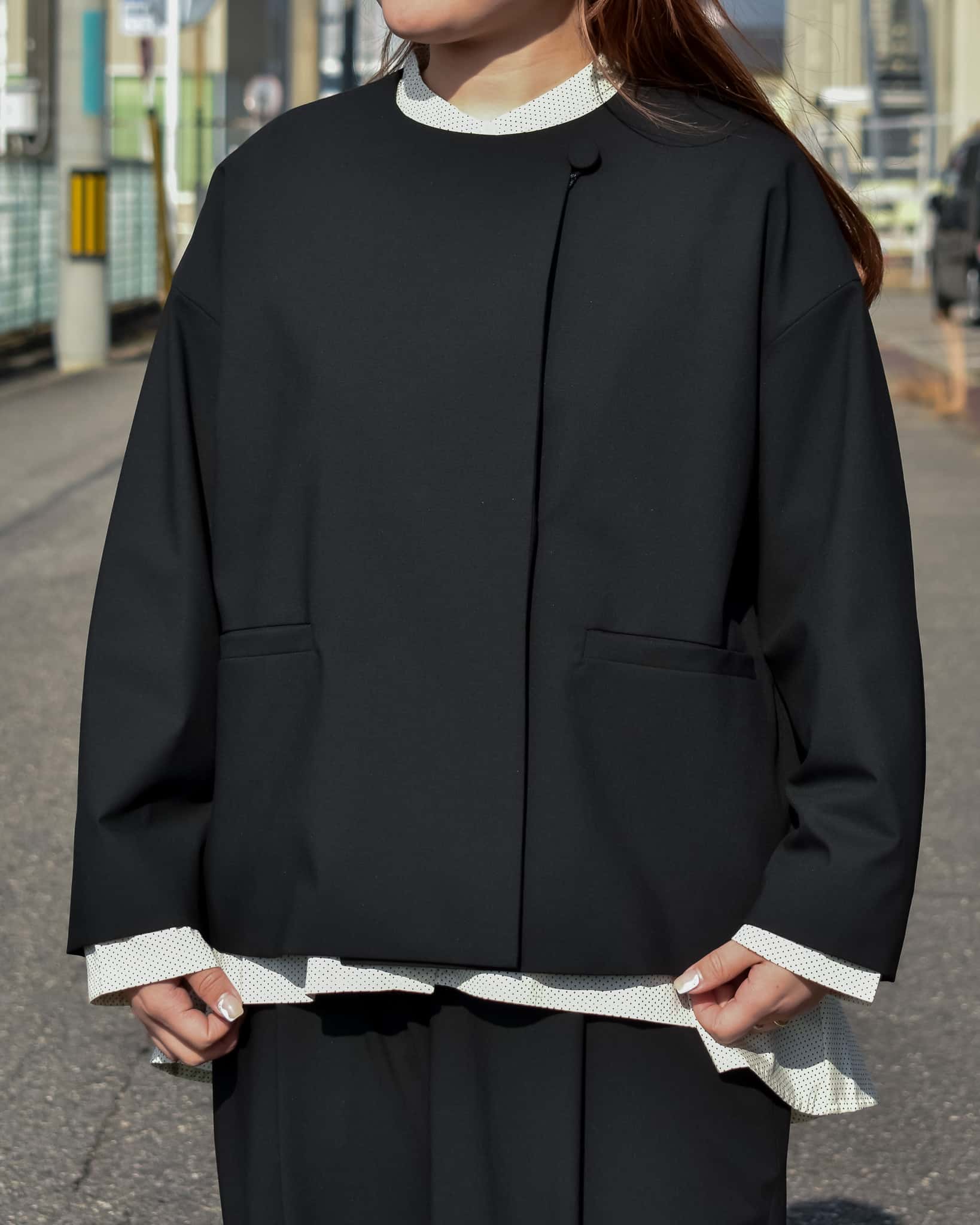 ノーカラーのすっきりとした首元、柔らかなドロップショルダー。