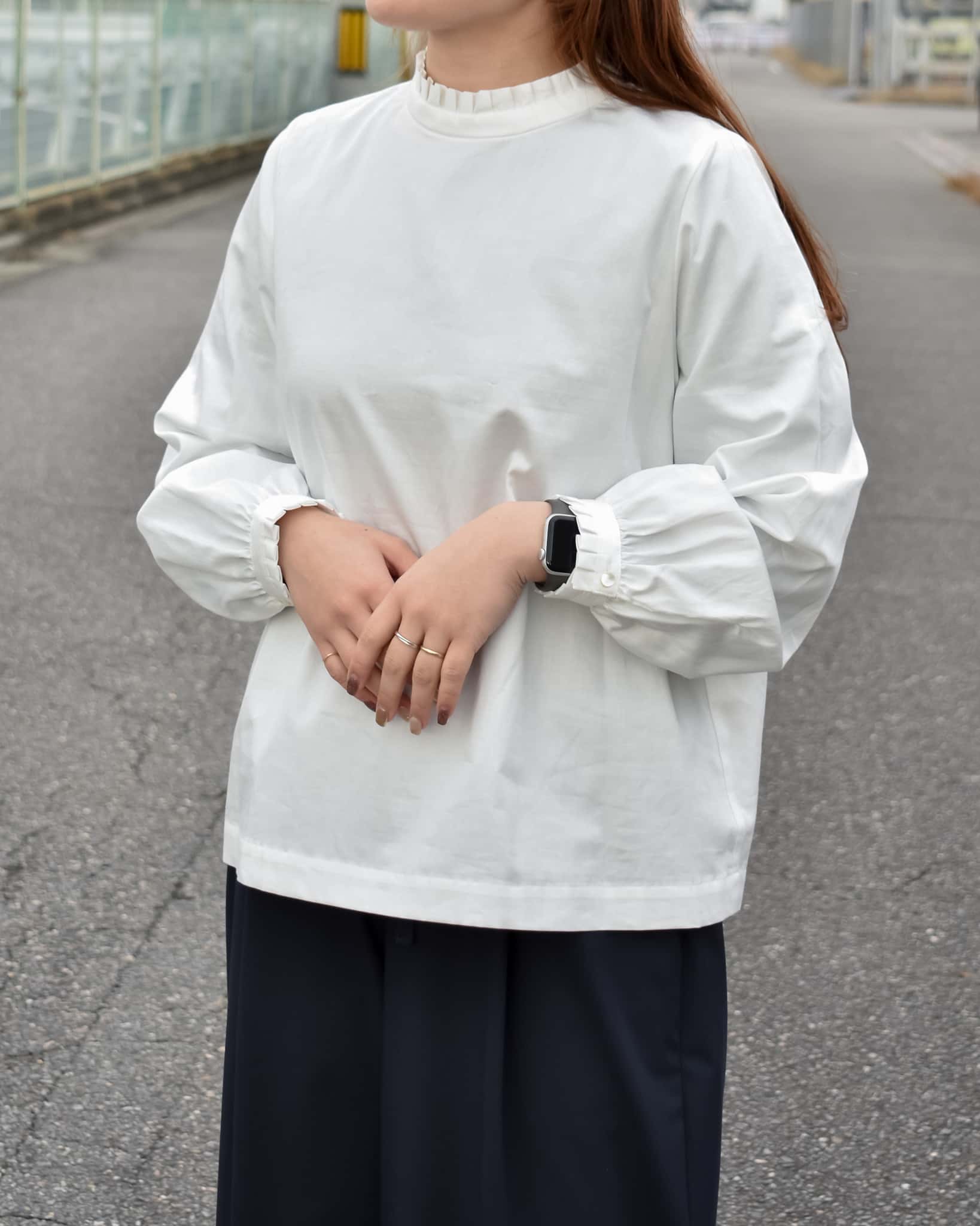 フリルカラーは甘すぎず、品のある印象に。