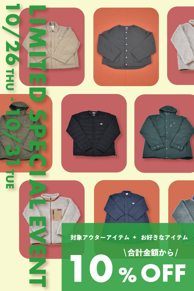 オンラインストア限定で、イベント対象のアウターとその他お好きなアイテム1点ご購入いただくと合計金額より10%OFFとなるお得なイベントを開催いたします。