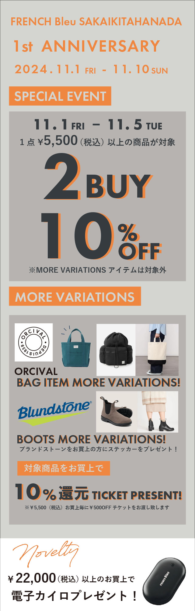 11/1(金)~11/5(火)の期間限定で店内商品2BUY10%OFFも開催いたします♪