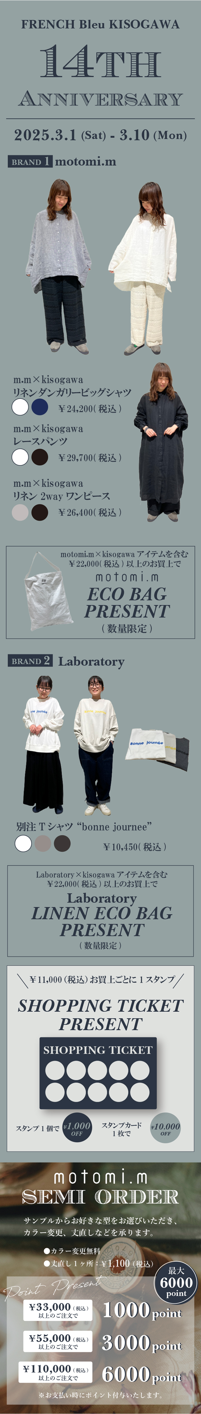 motomi.m×kisogawa別注アイテムを含む¥22,000(税込)以上のお買上でmotomi.mオリジナルトートバックプレゼント!
