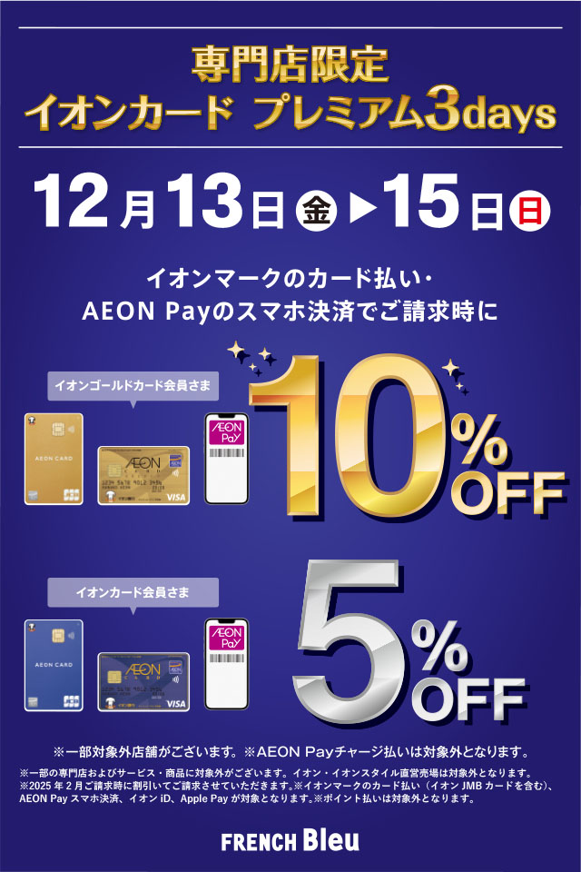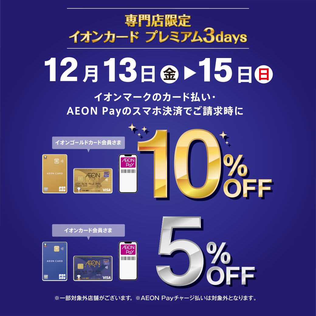 イオンマークのカード払い・AEON Payのスマホ決済で請求時にイオンゴールドカード会員さま10%OFF、イオンカード会員さま5%OFFとなります。